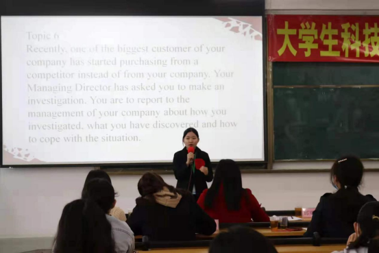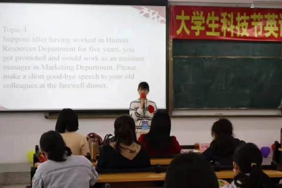 12月23日13:30,第九届大学生科技节英语口语决赛在教研楼203拉开帷幕。本次比赛由外语系大学英语教研室主办,外语系团总支、学生会协办。外语系负责人邱瑞君副主任和6位教研室代表老师出席并担任评委。校级组织代表、外语系各部门和班级代表以及我校的英语爱好者观看本次比赛。