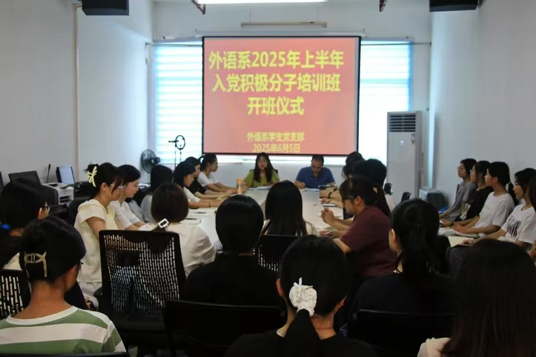 为全面贯彻落实新时代党的建设总要求,进一步加强入党积极分子的培养教育,夯实入党积极分子的思想基础,6月5日下午,外语系学生党支部在教研楼1104举行2025年上半年入党积极分子培训班开班仪式。外语系党总支书记陈志钦出席本次开班仪式并作动员讲话,会议由大二辅导员兼学生党支部书记蔡锐萍主持,本期29位入党积极分子全体成员参加。