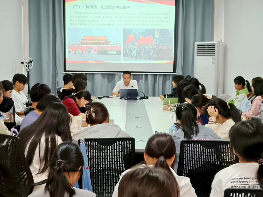 课堂上,李桂鑫副院长从回望、凝视、践行三个篇章展开讲解。一是回望,他带领学生回顾纪念抗日战争暨世界反法西斯战争胜利80周年阅兵场景,深入感受伟大的抗战精神,珍惜今天的幸福生活,让同学们深刻理解“铭记”是爱国的起点;二是凝视,通过对阅兵式上所展示的新型军种、新型装备介绍,深入学习习近平总书记提出的促进世界和平与发展,推动构建人类命运共同体的思想,让同学们深深牢记“自强”是爱国的根基;三是践行,李副院长通过回顾抗战胜利80周年祖国建设取得的伟大成就,寄语同学们做历史的“守护者”,做科技的“追光者”,做和平的“践行者”,把伟大抗战精神进一步化作团结的力量,在青春中书写担当答卷。