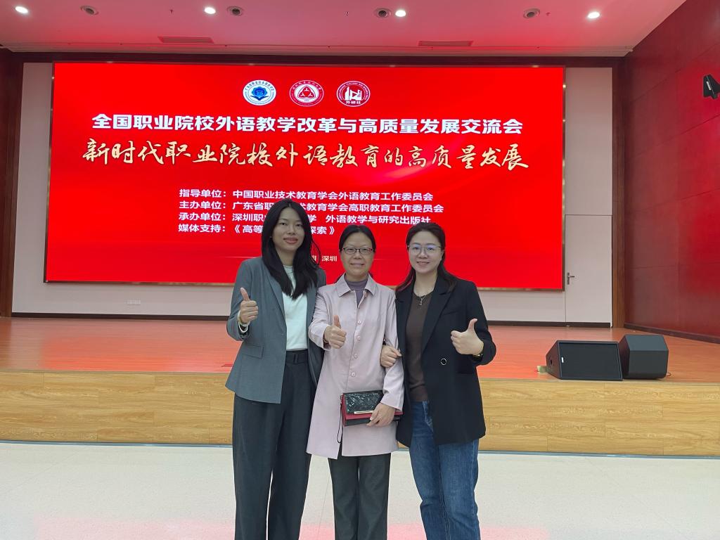 2025年11月22-23日,外语系主任邱瑞君、商务英语教研室主任陈露露、夏傲婷老师一行前往深圳参加全国职业院校外语教学改革与高质量发展交流会。此次由广东省职业技术教育学会高职教育工作委员会主办、深圳职业技术大学外语教学与研究出版社承办。