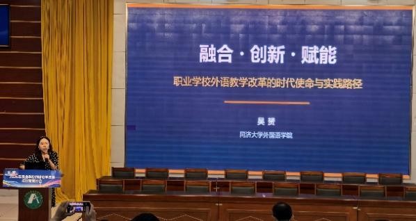 同济大学外国语学院院长、教育部职业院校外语类专业教学指导委员会副主任委员吴赟作题为“融合•创新•赋能:职业学校外语教学改革的时代使命与实践路径”的主旨报告。她指出,在当前外语专业关停并转的现实背景下,外语学科正面临“挑战中蕴藏机遇”的局面。首先,外语教学应回应产业需求,走“外语+X”复合路径,以真实工作任务驱动教学,构建混合式、多模态的学习生态。其次,职业学校要技术赋能,专业复合,探索人机协同新范式。最后,提升教师教学素养,建立多层次教学共同体,激活教师发展与体系建设。